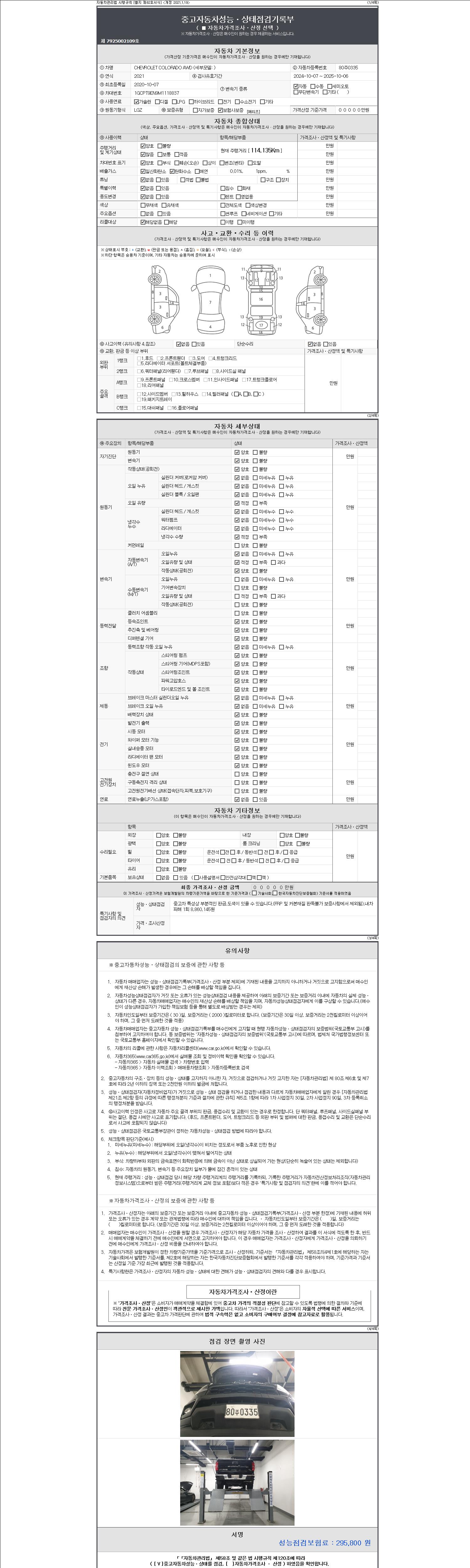 자동차관리법 시행규칙 제120조의 규정에 따라 별지 제 82호서식 《중고자동차 성능, 상태점검 기록부》를 발행한 성능, 상태점검자 및 매매자는 아래의 보증기간 또는 보증거리 이내의 중고자동차, 성능점검 기록부에 기재된 내용과 자동차의 실제 성능, 상태가 다른 경우 계약 또는 관계법령에 따라 매수인에 대하여 책임을 집니다.