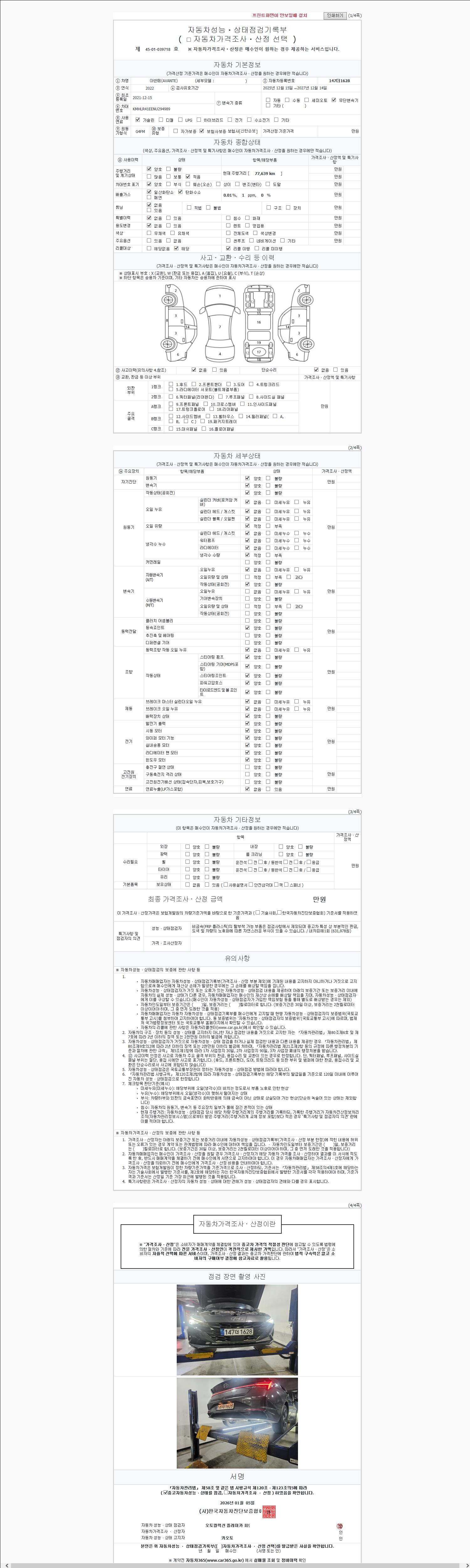자동차관리법 시행규칙 제120조의 규정에 따라 별지 제 82호서식 《중고자동차 성능, 상태점검 기록부》를 발행한 성능, 상태점검자 및 매매자는 아래의 보증기간 또는 보증거리 이내의 중고자동차, 성능점검 기록부에 기재된 내용과 자동차의 실제 성능, 상태가 다른 경우 계약 또는 관계법령에 따라 매수인에 대하여 책임을 집니다.