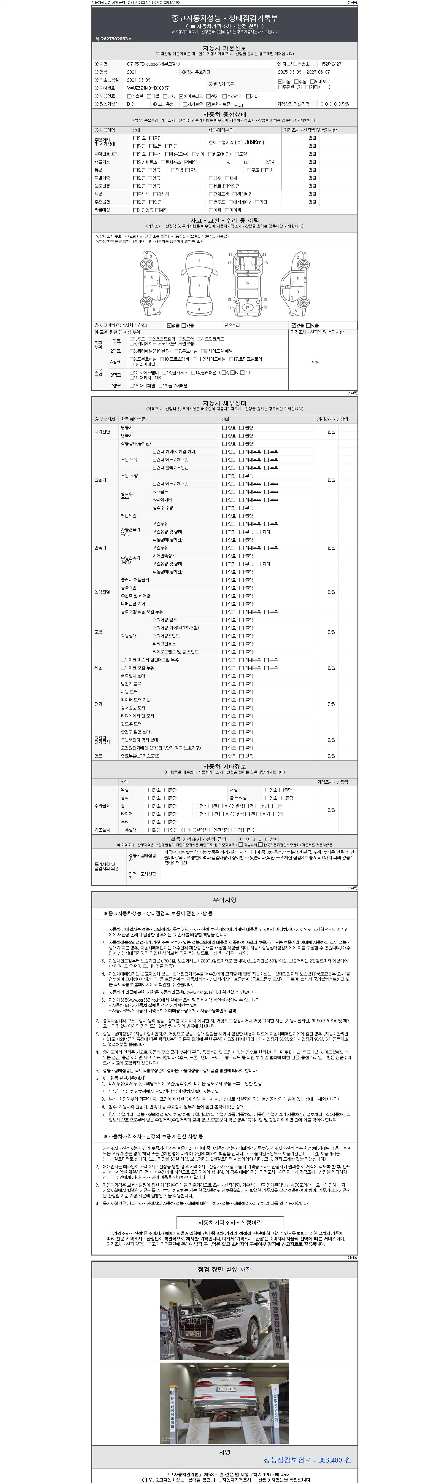 - 2. 차량 등록증이나 성능점검지 등을 상담자에게 요청및 확인하시고 사전에 미리 점검 하시기를 권유드립니다.