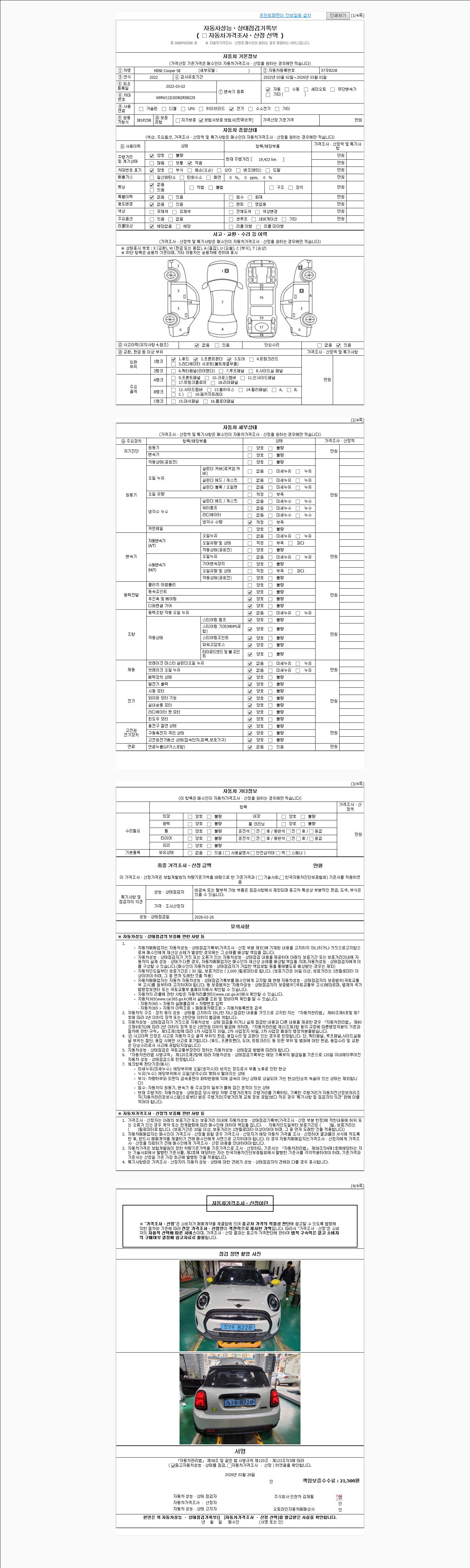 | 주행거리 | 19,424 km | 차량번호 | 57우8228 | 사고유무 | 성능기록부 참조 | 제시번호 | 제 2026010247 호 |