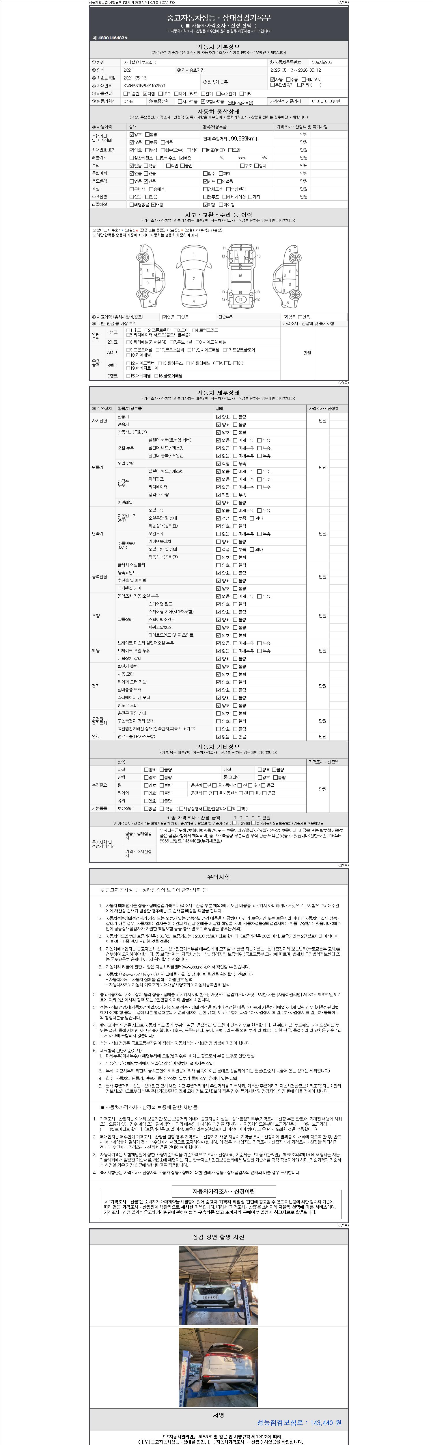 자동차관리법 시행규칙 제120조의 규정에 따라 별지 제 82호서식 《중고자동차 성능, 상태점검 기록부》를 발행한 성능, 상태점검자 및 매매자는 아래의 보증기간 또는 보증거리 이내의 중고자동차, 성능점검 기록부에 기재된 내용과 자동차의 실제 성능, 상태가 다른 경우 계약 또는 관계법령에 따라 매수인에 대하여 책임을 집니다.