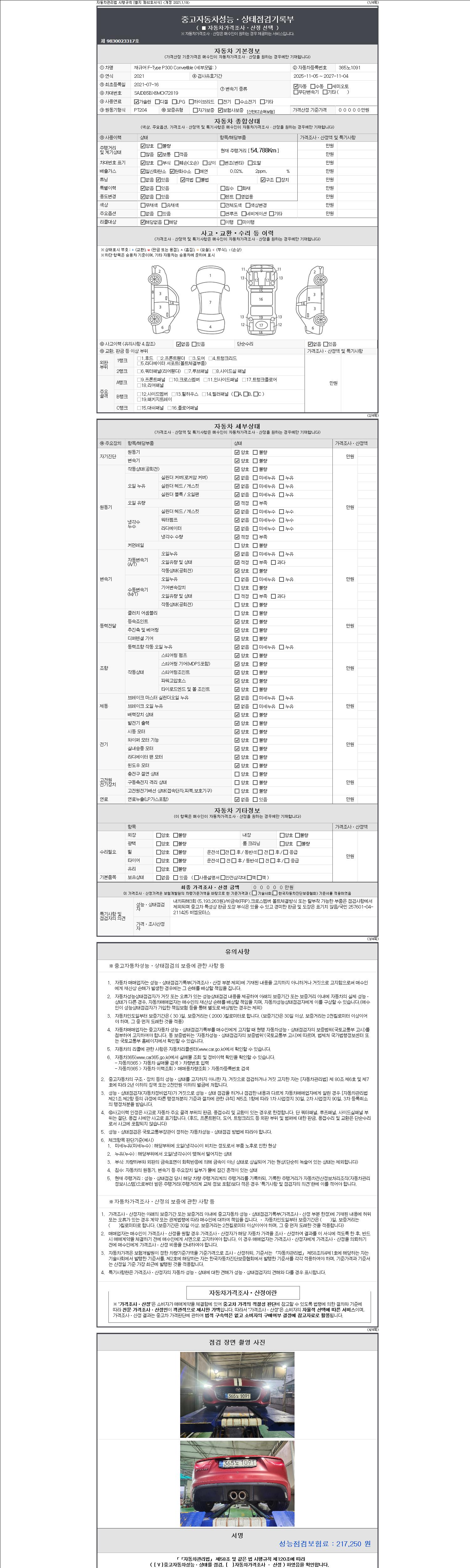 | 주행거리 | 54,788 km | 차량번호 | 365노1091 | 사고유무 | 성능기록부 참조 | 제시번호 | 제 2147483647 호 |