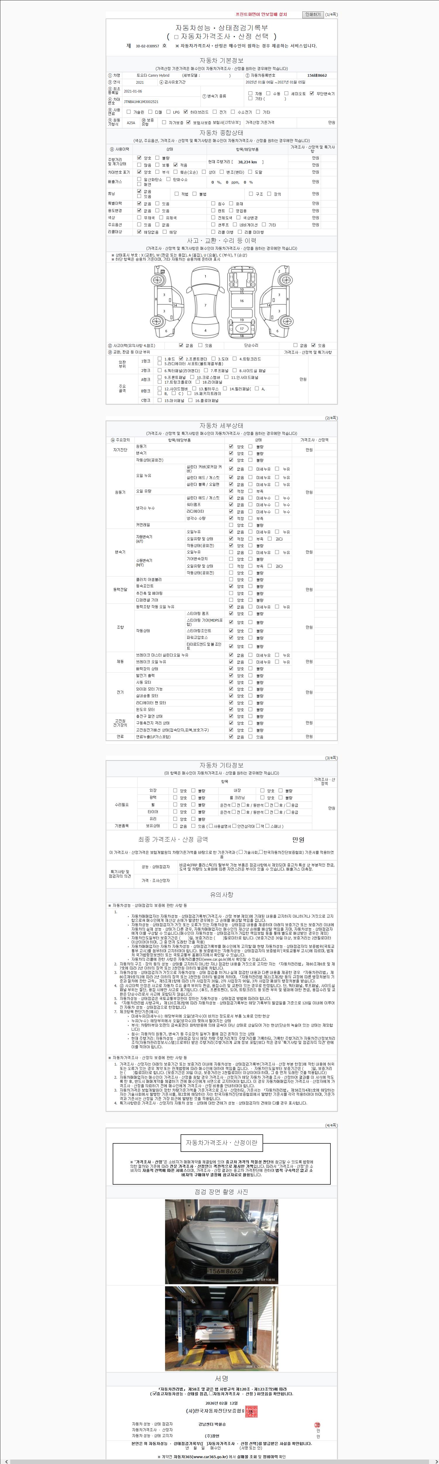 | 주행거리 | 38,234 km | 차량번호 | 156버8662 | 사고유무 | 성능기록부 참조 | 제시번호 | 제 2026019625 호 |