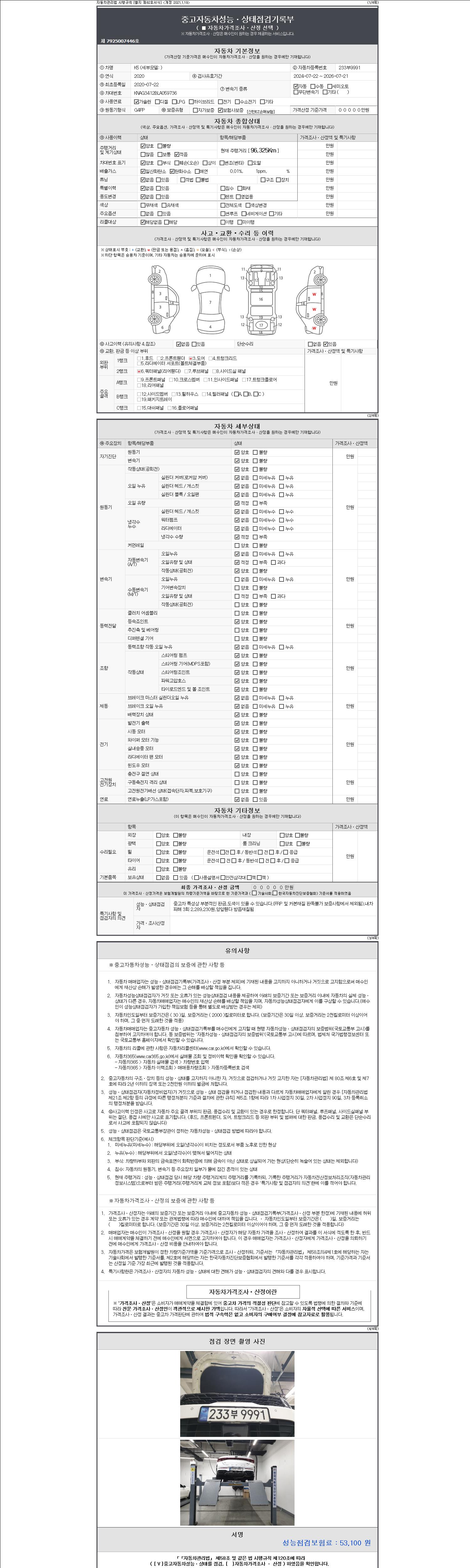 자동차관리법 시행규칙 제120조의 규정에 따라 별지 제 82호서식 《중고자동차 성능, 상태점검 기록부》를 발행한 성능, 상태점검자 및 매매자는 아래의 보증기간 또는 보증거리 이내의 중고자동차, 성능점검 기록부에 기재된 내용과 자동차의 실제 성능, 상태가 다른 경우 계약 또는 관계법령에 따라 매수인에 대하여 책임을 집니다.