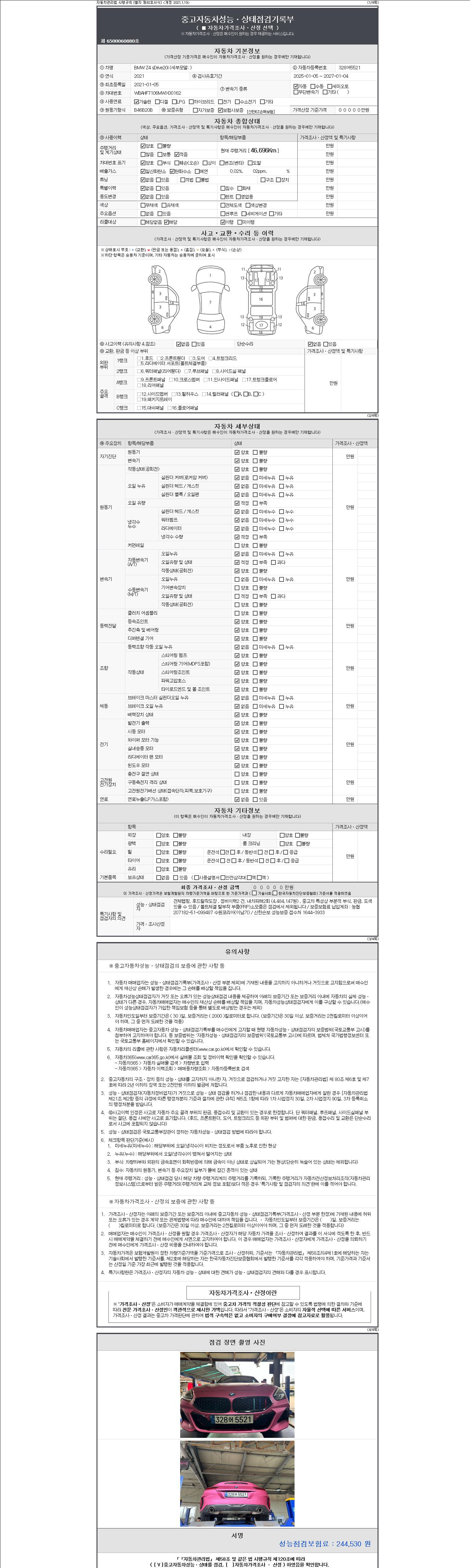 자동차관리법 시행규칙 제120조의 규정에 따라 별지 제 82호서식 《중고자동차 성능, 상태점검 기록부》를 발행한 성능, 상태점검자 및 매매자는 아래의 보증기간 또는 보증거리 이내의 중고자동차, 성능점검 기록부에 기재된 내용과 자동차의 실제 성능, 상태가 다른 경우 계약 또는 관계법령에 따라 매수인에 대하여 책임을 집니다.