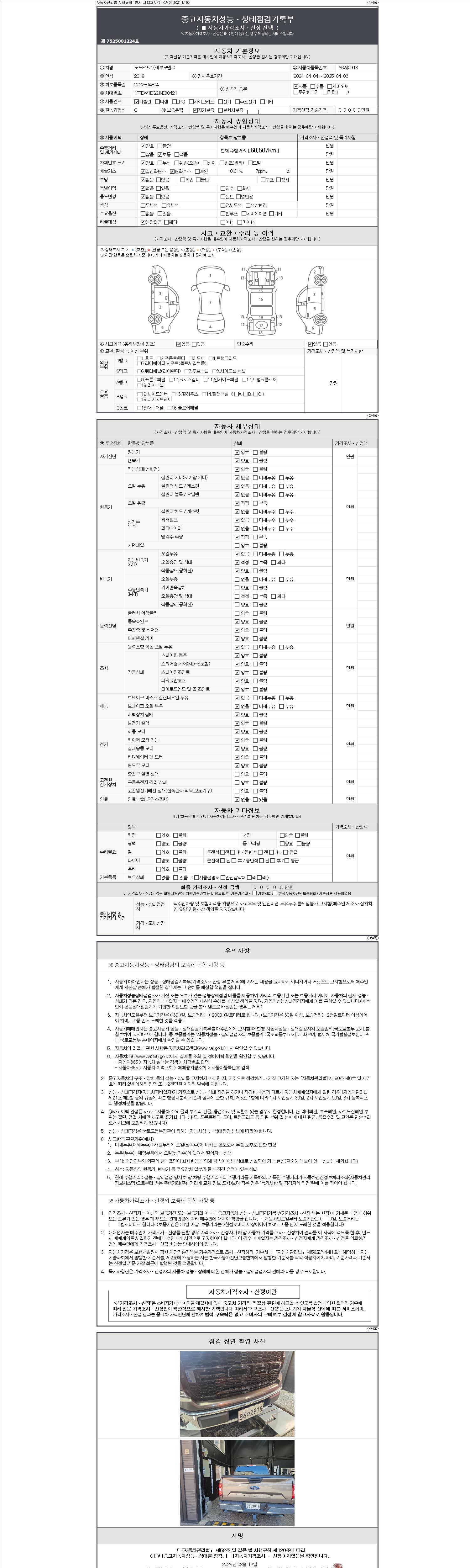 자동차관리법 시행규칙 제120조의 규정에 따라 별지 제 82호서식 《중고자동차 성능, 상태점검 기록부》를 발행한 성능, 상태점검자 및 매매자는 아래의 보증기간 또는 보증거리 이내의 중고자동차, 성능점검 기록부에 기재된 내용과 자동차의 실제 성능, 상태가 다른 경우 계약 또는 관계법령에 따라 매수인에 대하여 책임을 집니다.