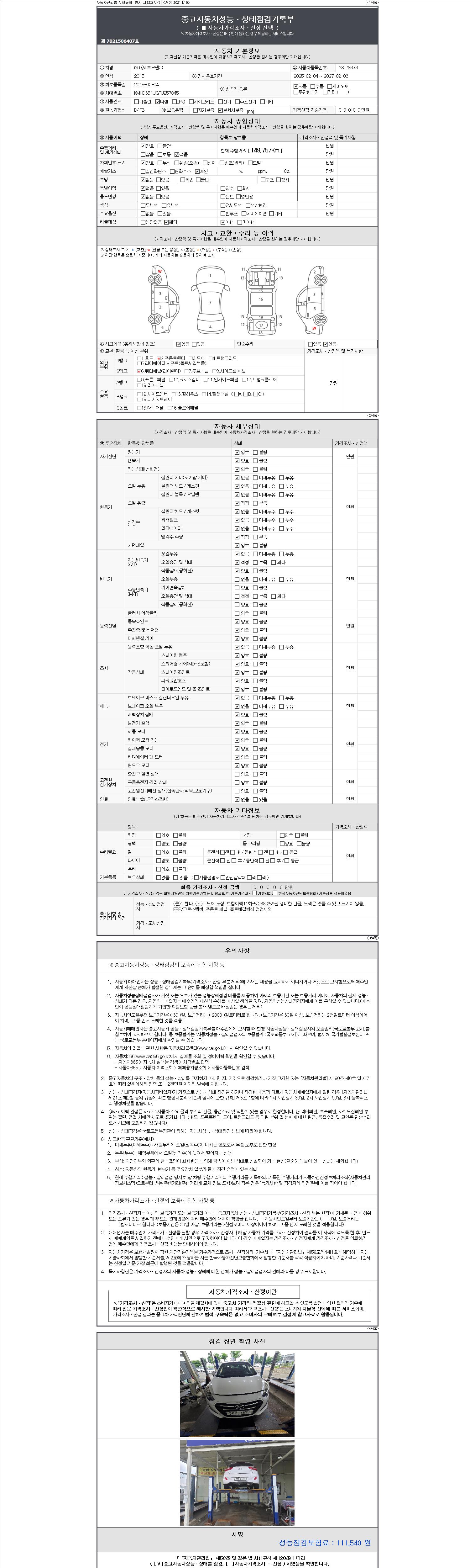 -중고자동차 매매업자를 통해 차량을 구입하실 경우 반드시 "중고자동차 성능, 상태점검 기록부"를 교뷰 받으셔야 하며, 매매업자는 반드시 의무 교부 하여야 압니다.