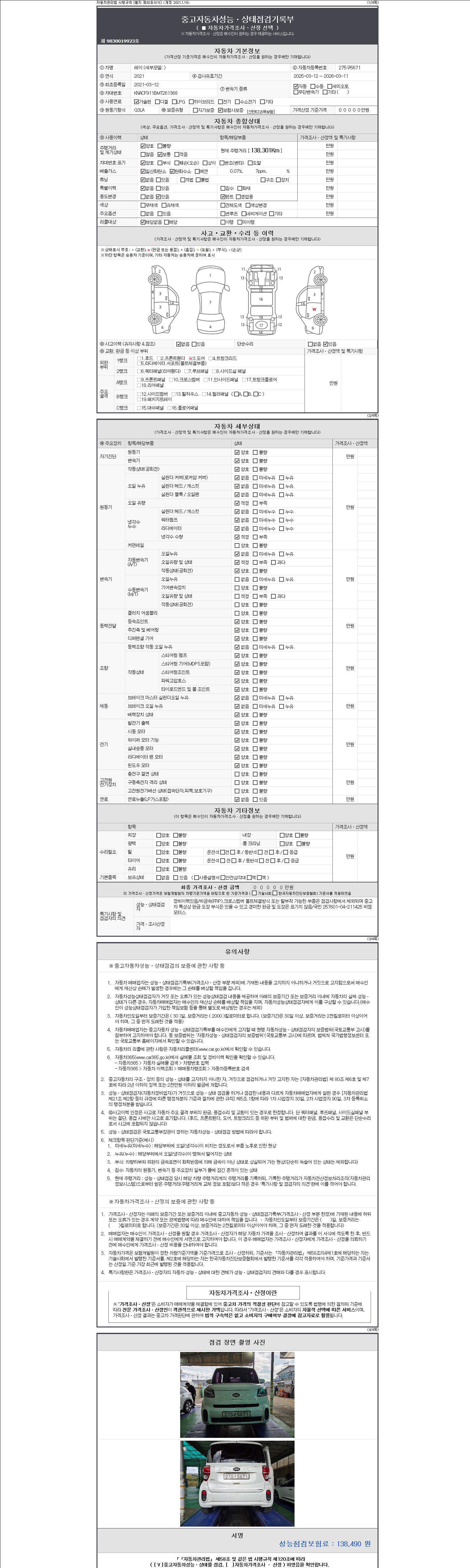 -중고자동차 매매업자를 통해 차량을 구입하실 경우 반드시 "중고자동차 성능, 상태점검 기록부"를 교뷰 받으셔야 하며, 매매업자는 반드시 의무 교부 하여야 압니다.