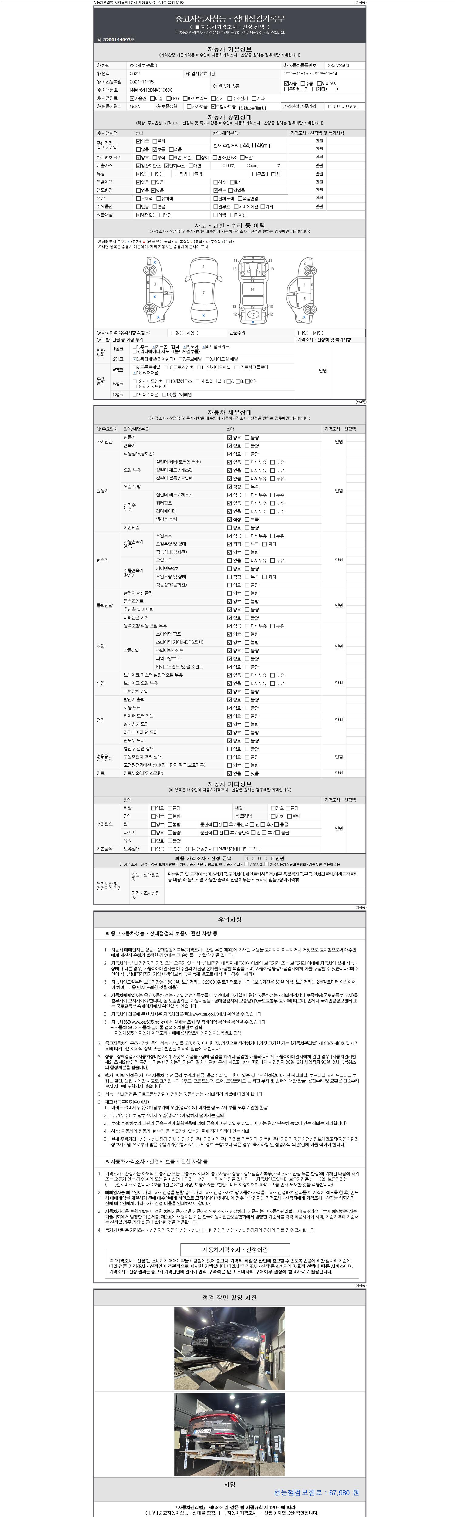 자동차관리법 시행규칙 제120조의 규정에 따라 별지 제 82호서식 《중고자동차 성능, 상태점검 기록부》를 발행한 성능, 상태점검자 및 매매자는 아래의 보증기간 또는 보증거리 이내의 중고자동차, 성능점검 기록부에 기재된 내용과 자동차의 실제 성능, 상태가 다른 경우 계약 또는 관계법령에 따라 매수인에 대하여 책임을 집니다.