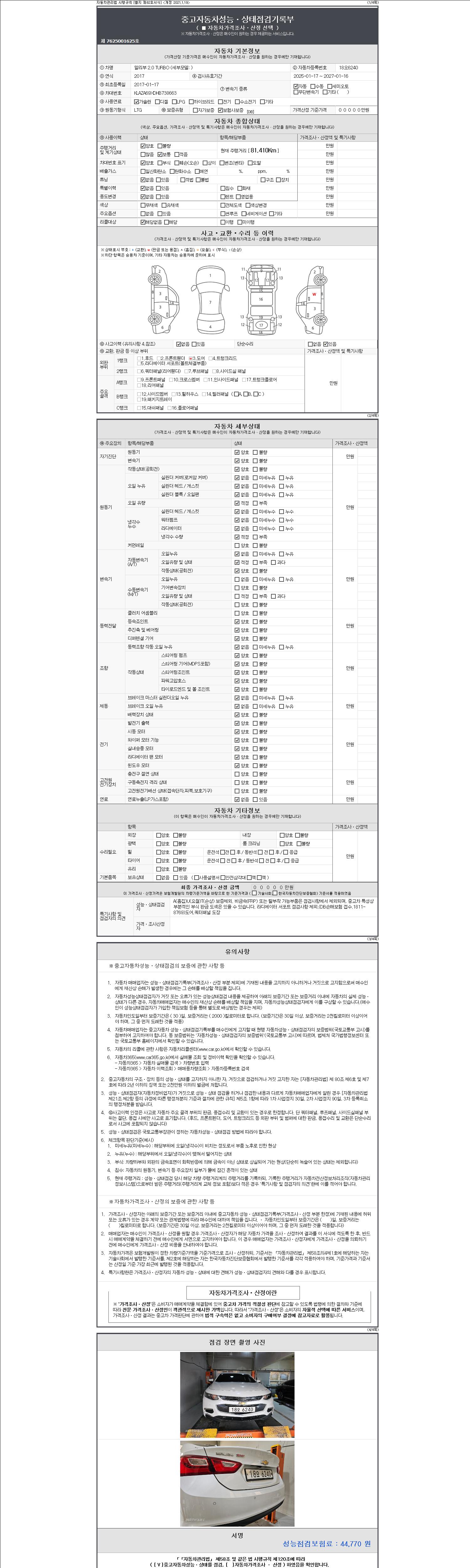 자동차관리법 시행규칙 제120조의 규정에 따라 별지 제 82호서식 《중고자동차 성능, 상태점검 기록부》를 발행한 성능, 상태점검자 및 매매자는 아래의 보증기간 또는 보증거리 이내의 중고자동차, 성능점검 기록부에 기재된 내용과 자동차의 실제 성능, 상태가 다른 경우 계약 또는 관계법령에 따라 매수인에 대하여 책임을 집니다.